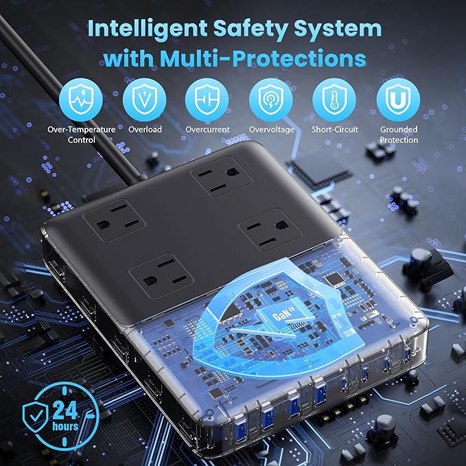 - 【Trustworthy Multi Plug Outlet Extender with 3 Years Warranty】Package includes USB C Fast Charging Station with 5ft undetachable extension cord (12-in-1, 200W), user manual, friendly customer service.