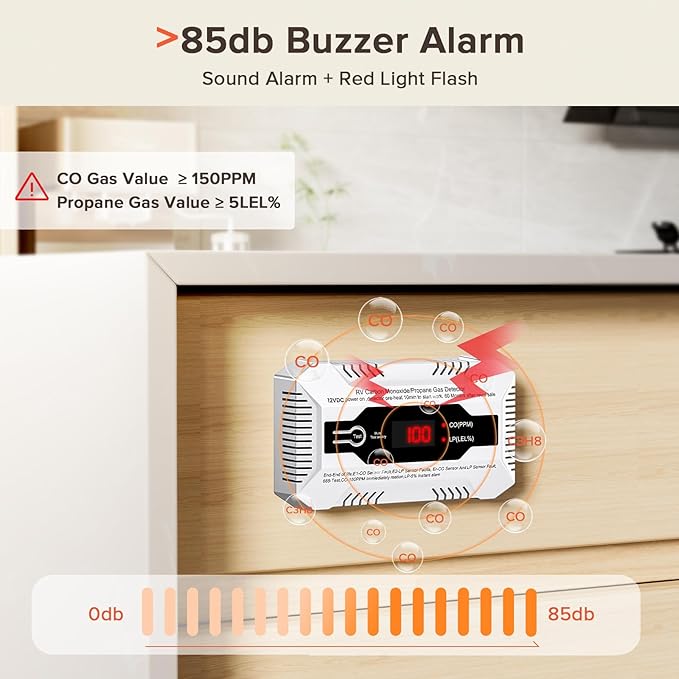 - Digital Display Alarm: When the RV detector detects carbon monoxide or propane, it responds in as fast as 0.5-2s. The easy-to-read digital screen displays the leak concentration. The gas leak detector will sounds when carbon monoxide exceeds 150 PPM or propane reaches 5 LEL%, giving you ample time to take precautionary measures to prevent any dangers and ensure the safety of your and your family lives and property