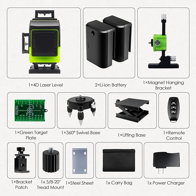 - 【Crystal Clear Visibility】The high-visibility laser lines are easily visible in both dim and bright environments, ensuring accurate measurements and reducing errors. Safety level-Class 2 , the green laser,Super bright and clear. Rechargeable & Long-Lasting: The laser level comes with two rechargeable batteries, providing extended usage time for continuous work. This feature, combined with the laser level stand, ensures that your leveling laser is always ready for any task.