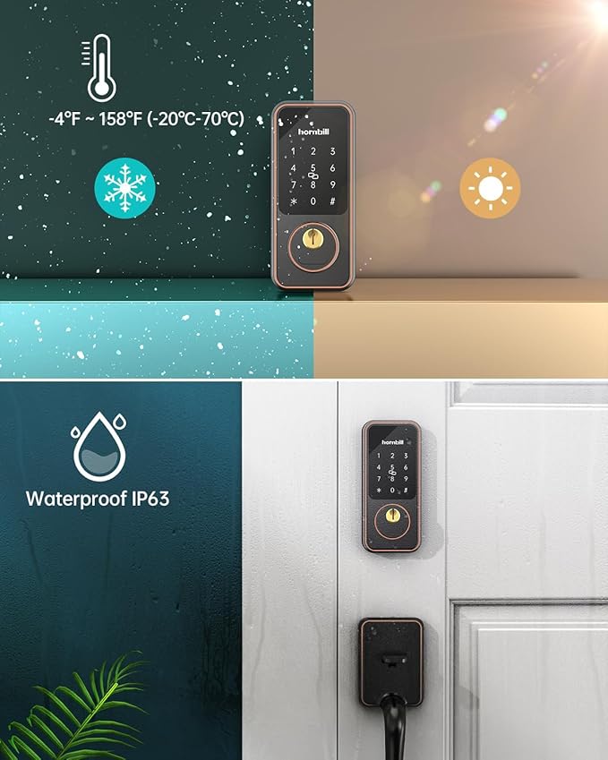- 【Build to Last】After Multiple tests, hornbill Smart Front Door Lock Set can operate well under -4 °F-158 °F (-20℃-70℃) with an IP65 Waterproof Level. Feature Shock Resistance + Anti-Peep OLED Keypad + Heavy Duty Alloy + Long Battery Using Time (Approx 20000+ times Lock/Unlock).