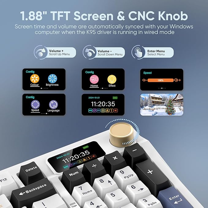 - 【1.88" TFT Screen & CNC Knob】It's time to pick the most stylish keyboard for you. The K95 gasket keyboard is surely your top choice. 1.88" TFT screen homepage can display various information you need. Not only you can adjust the time by downloading the K95 US Setup software, but also you can adjust volume, RGB light mode, language, and screen image/Gif by rotating or pressing the CNC knob(Note: Adjust time for Windows: Click on the K95 software in wired mode. Adjust time for Mac: bit.ly/MacK95Time).