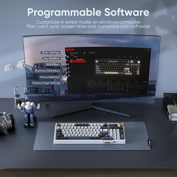 - 【Programmable Software】Programmable mechanical keyboard allows for deep customization of keyboard functions. Downloading the K95-US driver (only settable in 2.4G wireless or wired mode on WINDOWS) enables comprehensive programmability, key mapping, macro definition and adjust key sensitivity, sleep time, debounce, screen Gif image and backlight effects (including music rhythm backlight) to suit any workflow, gaming or life scenarios.
