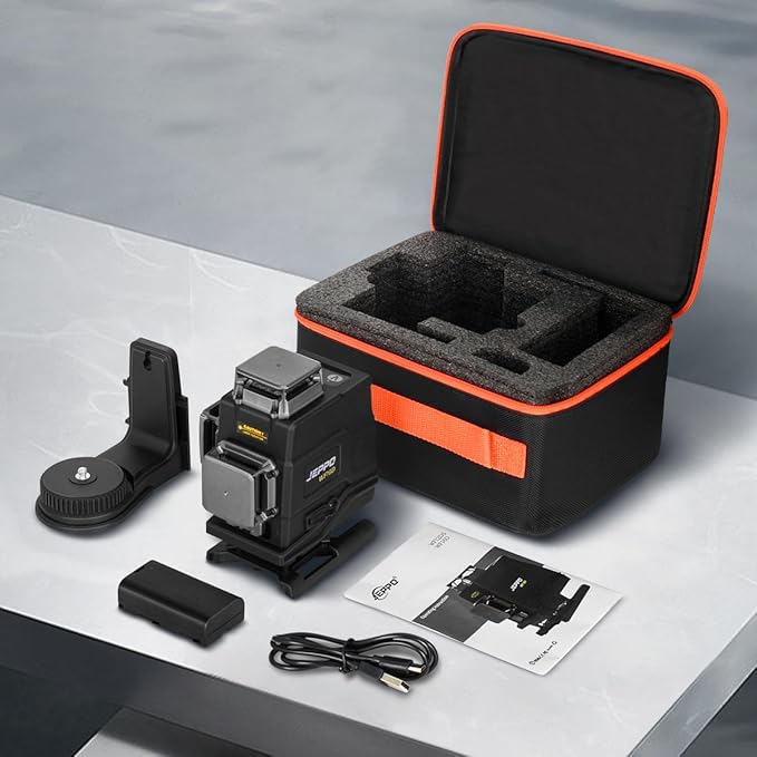 - Materials and Packaging Contents: IP54 waterproof/dustproof rating ensures stable and normal operation under complex working conditions. The surrounding TPR soft rubber protection provides shock resistance, wear resistance, and impact resistance. The packaging includes 1x laser level, 1x removable lithium-ion battery, 1x L-shaped magnetic rotating bracket, 1x Type-C power cable, 1x professional portable storage case, and 1x user manual