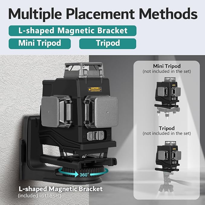 - Floor/Wall Use and Multiple Installation Methods: This line laser offers a 1/4"-20 mounting thread for securing it to a tripod or mounting pole. It comes with an L-shaped magnetic rotating bracket that can be adjusted to the desired angle. The bracket can be fixed to the wall using magnets or screws, allowing for use in a wider range of scenarios