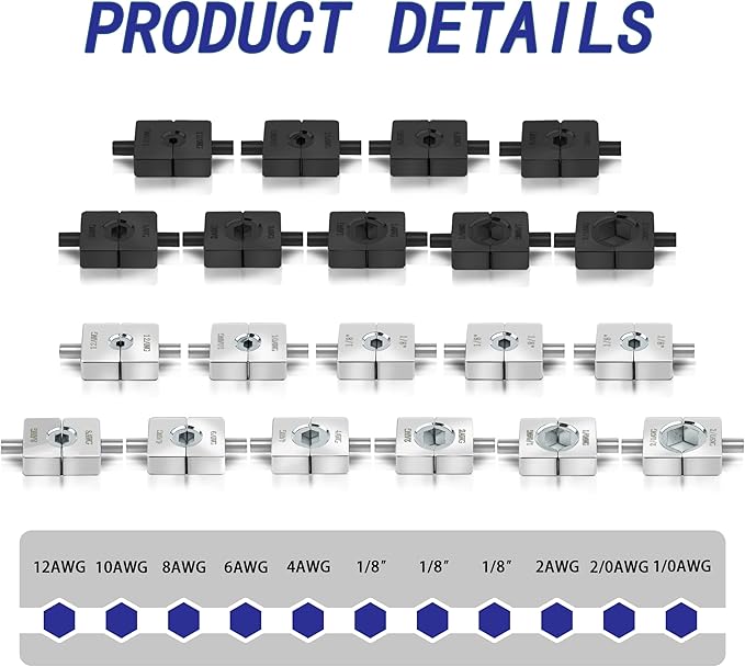 - FULLY CONFIGURED: Comes standard with thickened plastic case, solid and crash-proof. Includes manual, charger, batteries*2, electric crimper, 20 Dies (Metric dies: 4mm², 6mm², 10mm², 16mm², 25mm², 35mm², 50mm², 70mm²; US standard dies: 12 AWG, 10 AWG, 8 AWG, 6 AWG, 4 AWG, 2 AWG, 1 AWG,1/0 AWG, 2/0 AWG and 3 sets of 1/8" stainless steel wire rope dies)