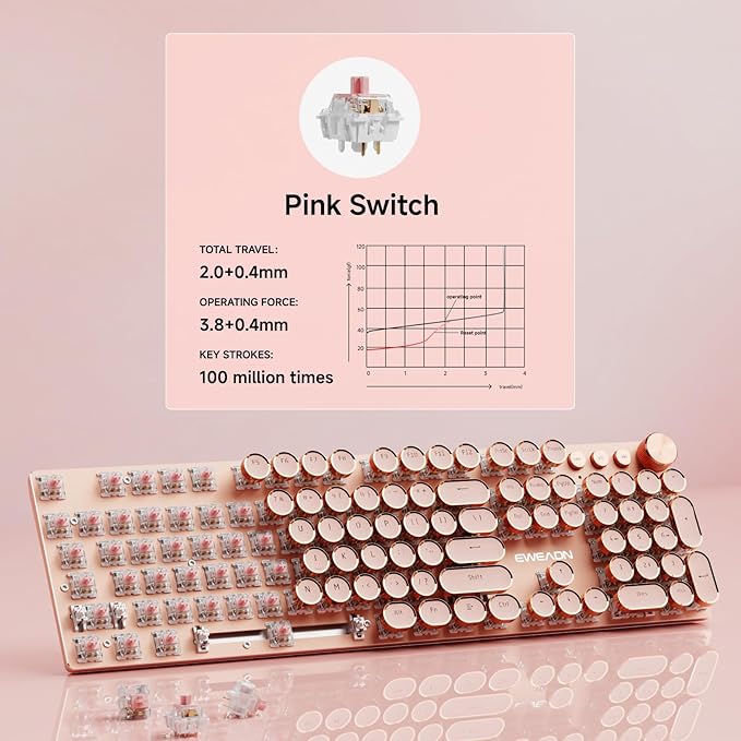 - 【Retro Typewriter Mechanical Keyboard】:The typewriter gaming keyboard has mechanical custom pink switches that feature a smooth linear feeling, and low resistance without a tactile bump feel. round keycaps of the punk mechanical keyboard look like a classical typewriter. Keycaps have a matte texture and upgraded touch feel and the sound is quiet when the button is pressed lightly giving you a comfortable typing feeling and a stable click touch.