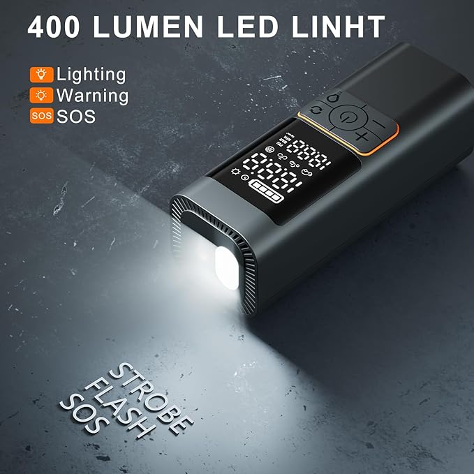 - 【More than an air pump】 The high-brightness LED flashlight provides 400 lumens of light, with 3 modes including constant light, strobe, and SOS, it is perfect for camping, outdoor activities, indoor use, emergencies, travel, and more. It is also a portable power bank. Through the USB port, you can charge your USB devices and the jump box supports 48 hours of high-brightness lighting.