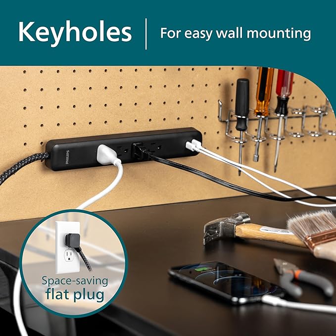 Philips 4-Outlet Surge Protector, 4ft Braided Cord, 1-USB-C, 1-USB-A, Extension Cord, Power Strip, for Home, School, or Office, 15W, 450J, Black, SPP3393B/37