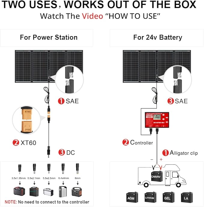 - 【All-in-One Kit with Accessories】Includes 300W folding panel, PWM controller, 9.8 ft (3 m) cable, 3.3 ft (1 m) cable, adapters, and manual. Optional 19.7 ft (6 m) XT60 extension cable and mounting bracket available separately.
