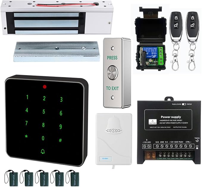 Electric Magnetic Lock Kit 1200lb Electromagnetic Lock Waterproof RFID Keypad with Press to Exit Button Doorbell Chime and Remote Control for Door Access System
