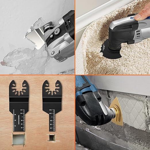- Wide Usage: Bi-metal oscillating blades cut high-hardness metals and cables, while a spatula removes cement. Diamond blades polish cement floors. These multi-tool blades are versatile, handling wood, plastic, metal, pipes, PVC, nails, wallpaper, plasterboard, and more for DIY projects.
