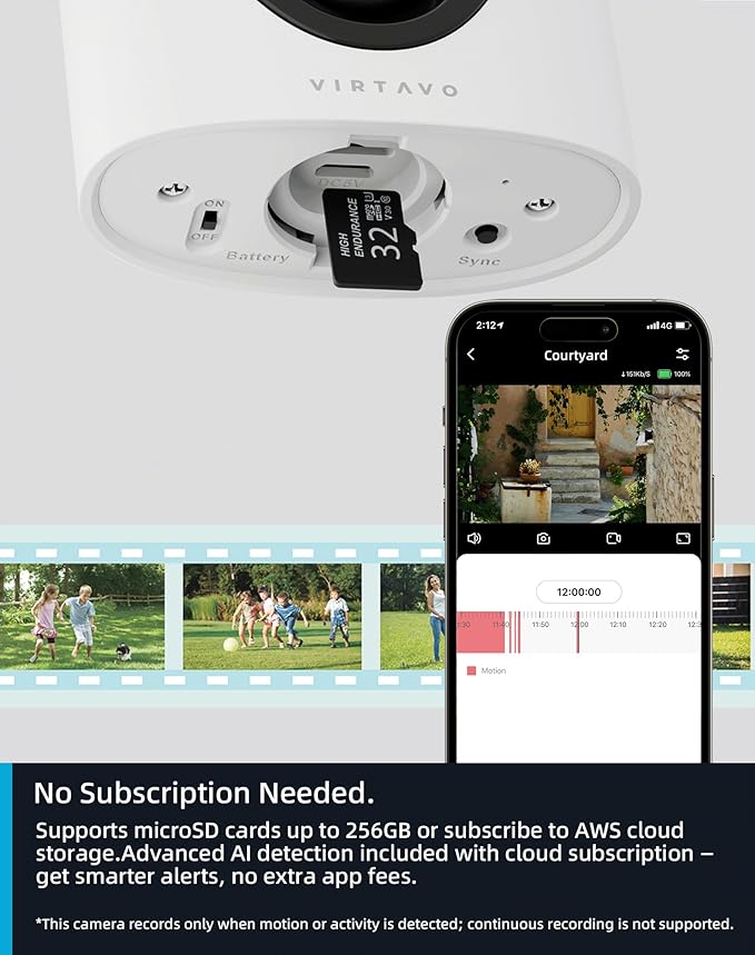 - 【Flexible Storage & Data Privacy】Choose the storage option that fits your needs. Use an SD card (32GB to 256GB) for local backup, even during network outages, or opt for encrypted cloud storage with 7- or 30-day video history. Your data, your choice.