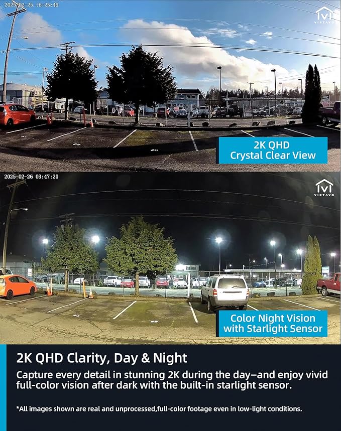 - 【2K QHD & Color Night Vision】Experience crystal-clear security with 2K QHD resolution and advanced Starlight technology. This wireless outdoor camera delivers vivid, color-rich images even in low light, thanks to its F1.6 aperture and 3.0mm lens. Plus, 2 IR LEDs ensure sharp night vision for 24/7 protection.