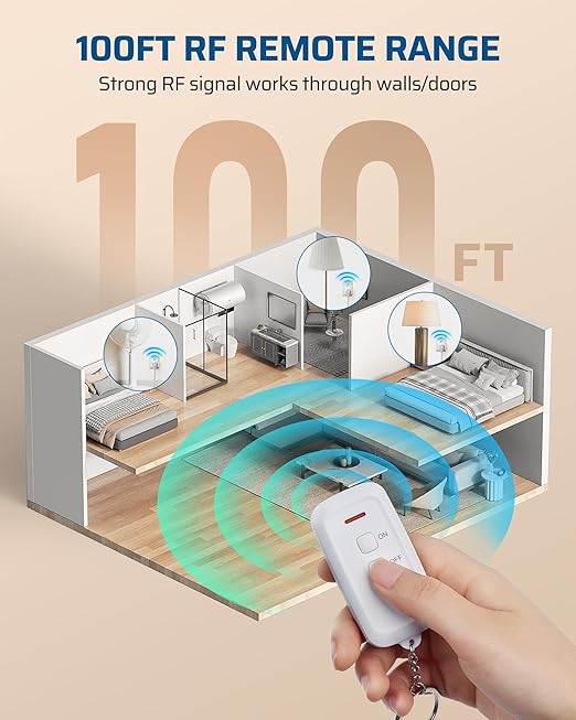 - [Strong Signal] Strong RF signal effortlessly passes through walls and doors without interference, the wireless remote control outlet offers 100ft control range; No need to leave the comfort of your warm bed, sofa, or struggle in the dark—control your socket switches without bending down or walking around; transmitter includes a keychain for easy portability