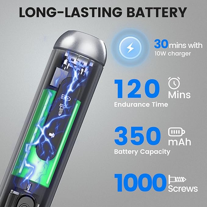 - Rechargeable mini electric screwdriver powered by a 350 mAh fast‑charge battery (30 min USB‑C), delivering uninterrupted cordless convenience for all your precision tasks.