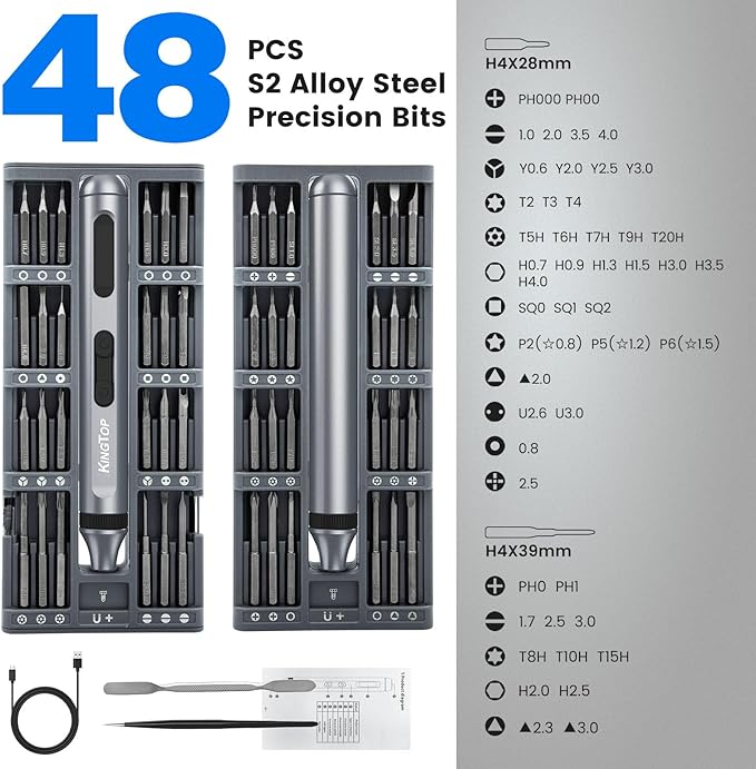 - 48‑Piece precision screwdriver set featuring S2 steel magnetic bits and compatible with Phillips, slotted & Torx sizes, plus an ergonomic pop‑up case for organized storage.