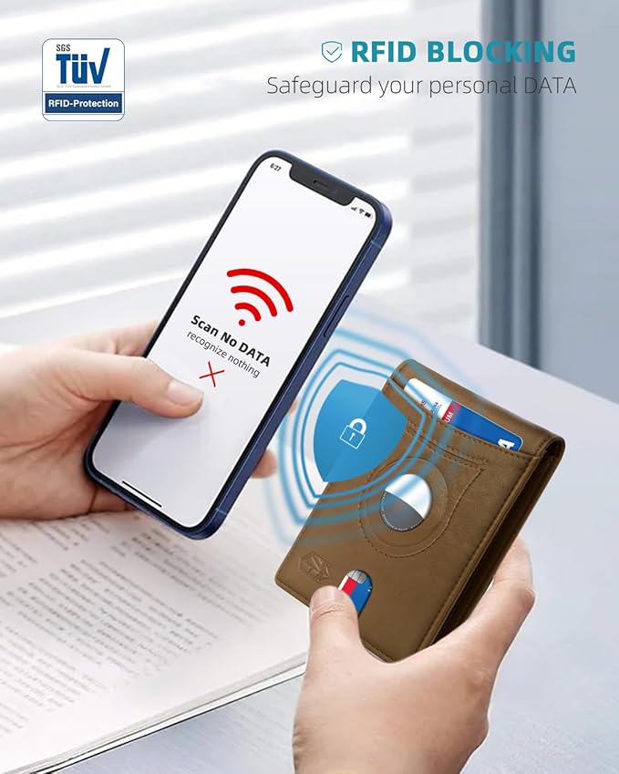 - ๐๐๐ ๐๐๐.๐๐๐๐๐๐๐.?๐๐๐๐๐๐๐ - our wallets are equipped with German institute certified RFID SECURE Technology, a unique metal composite, engineered specifically to block 13.56 MHz or higher RFID signals and protect the valuable information stored on RFID chips from unauthorized scans.It is ideal for carrying business cards, credit and debit cards, bills etc.