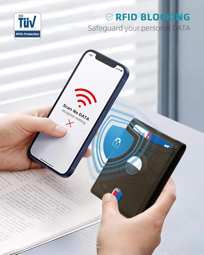 - ๐๐๐ ๐๐๐.๐๐๐๐๐๐๐.?๐๐๐๐๐๐๐ - our wallets are equipped with German institute certified RFID SECURE Technology, a unique metal composite, engineered specifically to block 13.56 MHz or higher RFID signals and protect the valuable information stored on RFID chips from unauthorized scans.It is ideal for carrying business cards, credit and debit cards, bills etc.