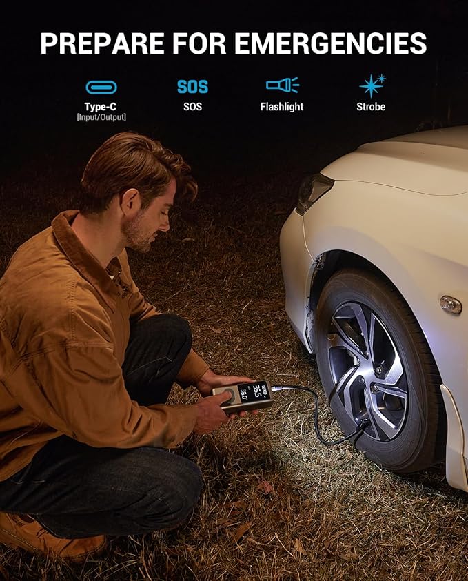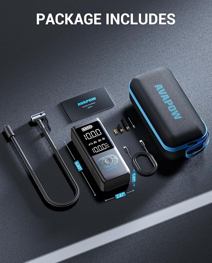- Multi-Functional Design: More than just an inflator, the AP18 car tire air pump portable features three light modes (flashlight, SOS, strobe) and can charge other smart devices. Lightweight only 1.2 pounds, it comes with a 1x 1.64ft high-pressure anti-scald hose, 4x inflation nozzles, and a 1x carry-on toolbox, making it the ultimate all-in-one inflation solution.