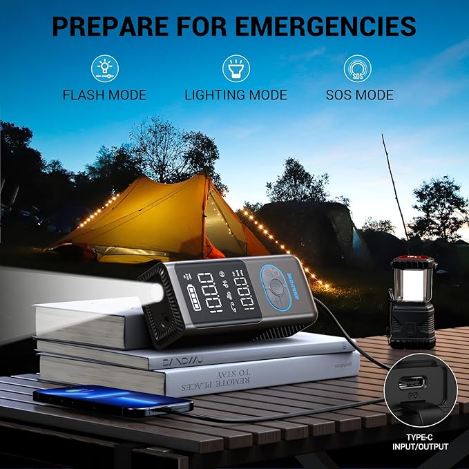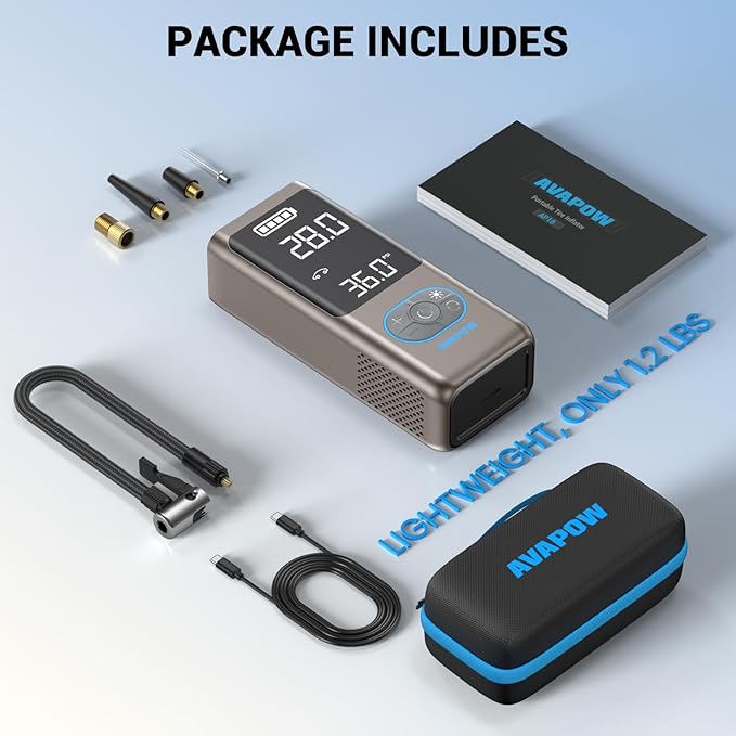 - Inflator Air Pump & Emergency Tool: More than just an electric pump, the AP18 portable air pump features three light modes (flashlight, SOS, strobe) and can charge other smart devices. Lightweight only 1.2 pounds, it comes with a 1x 500mm high-pressure anti-scald hose, 4x inflation nozzles, and a 1x carry-on toolbox, making it the ultimate all-in-one battery air pump.