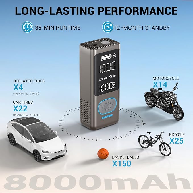 - Rechargeable Air Pump: The robust 8000mAh battery delivers up to 35 minutes of runtime, inflating up to 22 tires (195/65/R15, 30-36PSI), 4x deflated car tires, 14x motorcycle tires, 25x bike tires, or 150x basketballs on a single charge. Plus, with a 12-month standby time, it’s always ready to go when you need it!