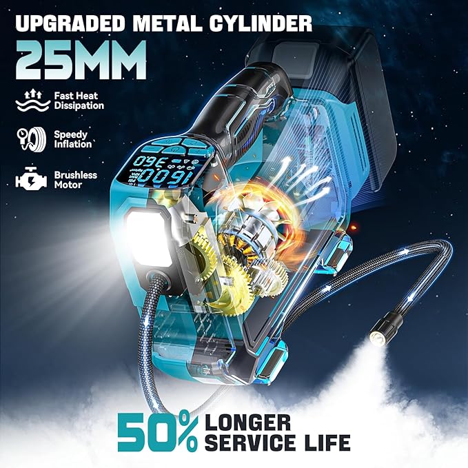 - 【FAST INFLATION 】Air compressor portable equipped with a 25mm large-cylinder and brushless motor, inflate fast, up to 30L/min, tires of size 195/65/R15 can be filled in less than 3.5 minutes. The built-in flashlight with 3 modes (SOS, Hazard warning,Normal light) makes Portable Tire Inflator perfect for night time emergencies or low-light conditions.