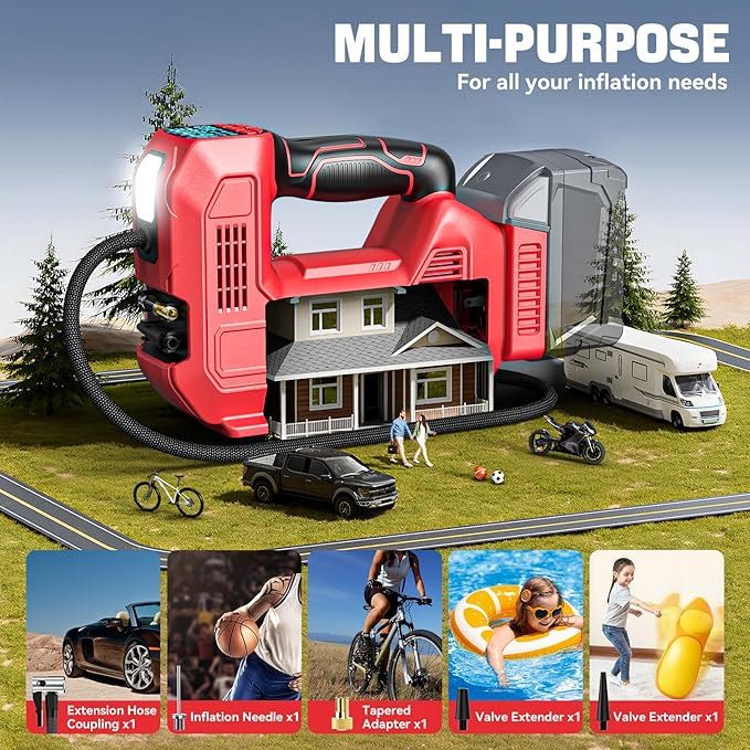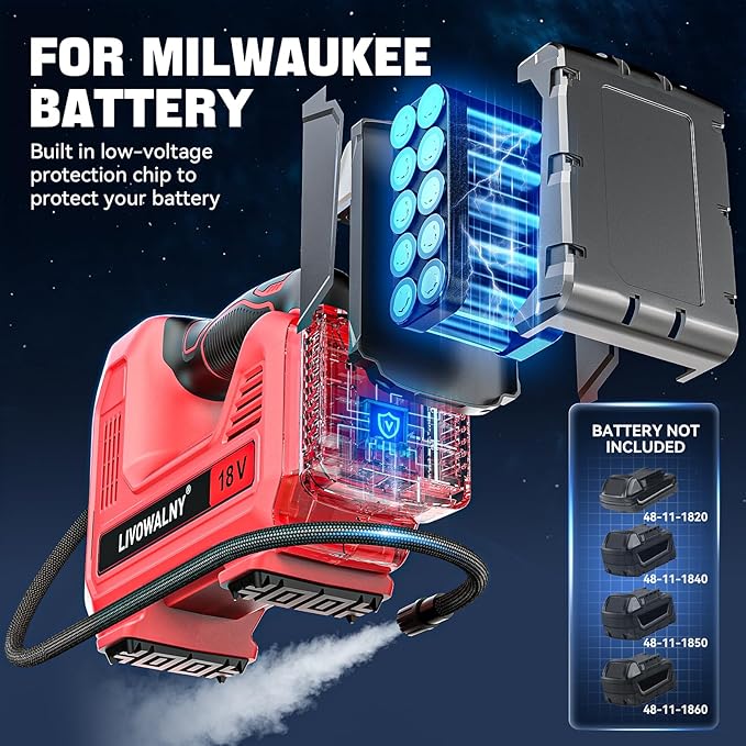 - 【Applicable Battery Models】This Tire Inflator is compatible with milwaukee for m18 18V batteries 48-11-1820 48-11-1822 48-11-1840 48-11-1850 48-11-1852 48-11-1860 48-11-1862 and more. NOTE: Battery is not included.