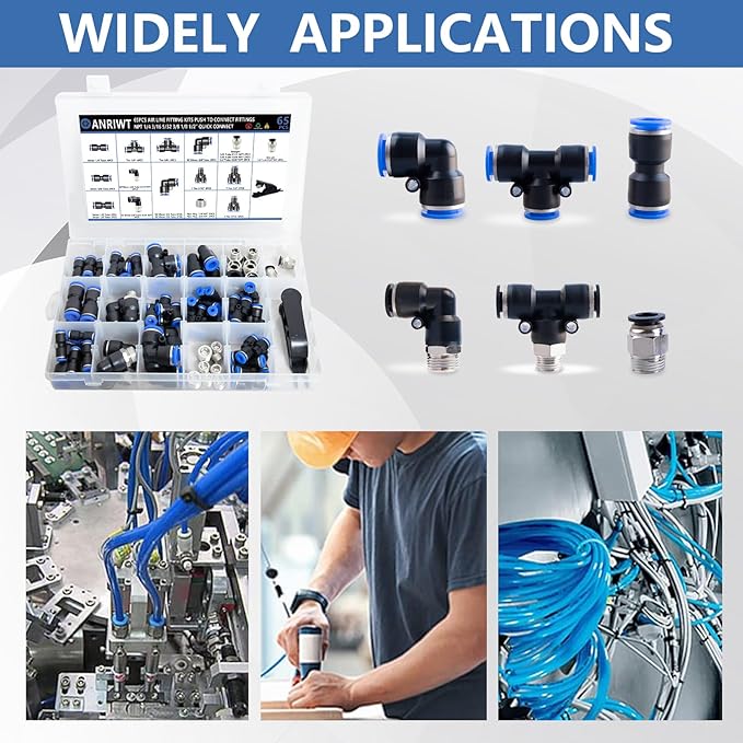 - WIDE APPLICATION : The air line fittings kit are suitable for PU / PA / PE / PVC lines or hoses. They widely applied in manufacturing production lines, truck,trailer repairs, Pneumatic tools, instruments, mechanical gas piping and laboratory automation equipment. Besides those, daily gardening maintenance and lawn mower machine areas also need those items