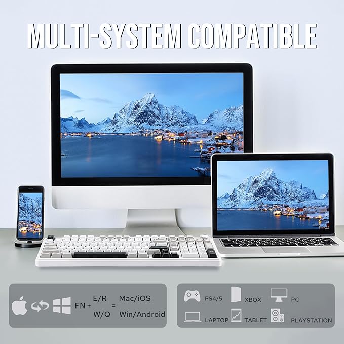 - Tri-Mode Connectivity&8000mAh Battery: The F99 Pro wireless mechanical keyboard supports Bluetooth 5.0, 2.4GHz wireless, and Type-C USB wired connections. It can connect up to five devices simultaneously and is compatible with Windows, Mac, and Android operating systems. Switching between devices is easy with the shortcut keys. The F99 Pro keyboard is suitable for PC, laptop, tablet, smartphone, PS, XBOX, etc., meeting all users' needs. Additionally, equipped with a robust 8000mAh battery, F99 PRO gaming keyboard offers long-lasting power for extended play sessions without worrying about frequent charging