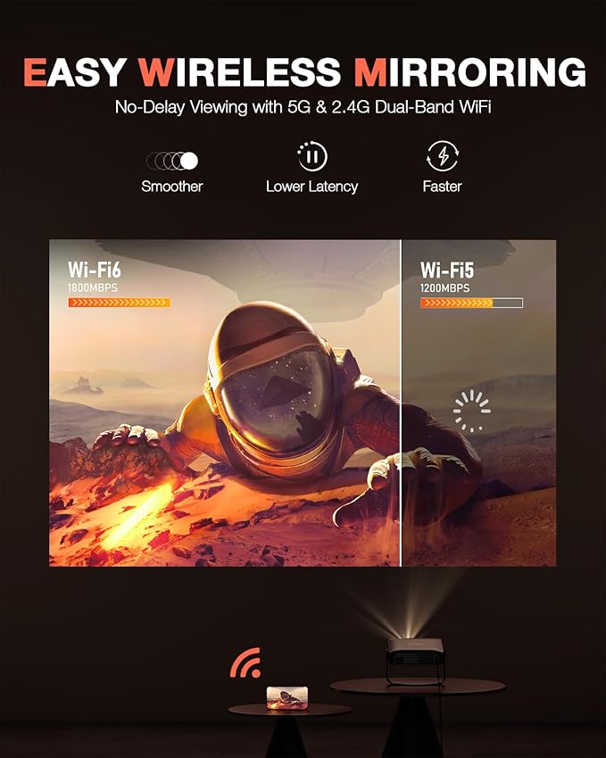 - [Lightning-Fast WiFi 6 & Bluetooth 5.2] WiFi 6 ensures stable, rapid signal transmission, empowering the wireless projector with seamless wireless screen mirroring for ultra-smooth movie & gaming sessions. Built-in Bluetooth 5.2 enables the outdoor projector to have seamless audio sync, transforming it into a Bluetooth speaker for on-demand phone music. Immersive viewing awaits! (Due to HDCP copyright limitations, Netflix, Prime Video, Hulu, etc. can only be played via TV Stick, Roku, etc. )