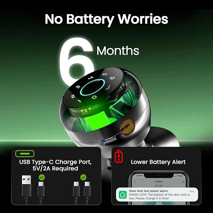 - 【Long-Lasting Battery & Easy Installation】The fingerprint door knob with lock features a 400mAh rechargeable battery that fully charges in 4-6 hours and 10,000 unlocks or 300+ days ( based on usage frequency. ) Easy to install with a screwdriver and fits apartments/office doors (1-3/8" to 2-1/4" thickness). Please confirm the product dimensions before purchase