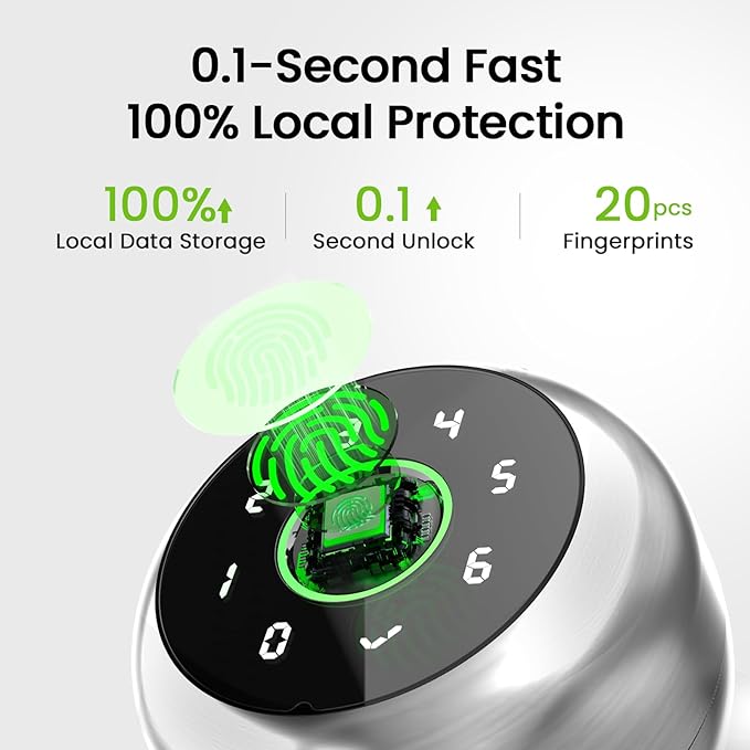 - 【Advanced Security & Privacy Protection】This thumb print door knobs can be unlocked in just 0.1 seconds with 99.9% accuracy. The self-learning AI of our biometric door knob improves recognition speed and accuracy over time. 100% local fingerprint data storage WITHOUT cloud storage for enhanced privacy.