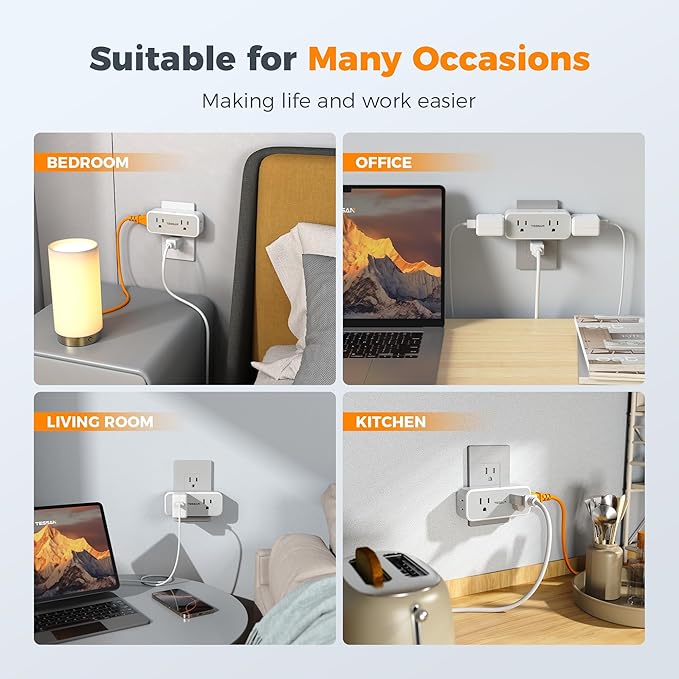 - Space Saving: Plug TESSAN multiple outlet wall plug on the top of outlet without blocking the other below, and create a multiple port charging station in your bedroom, kitchen, or any area with limited outlets; Fit for both GFCI and standard receptacles