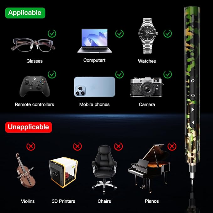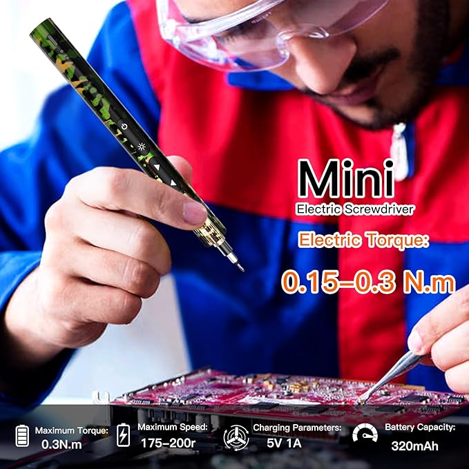 - Electric screwdriver battery capacity is 320mAh, the power screwdriver charging parameters is 5V/1A; precision screwdriver set is suitable for fast disassembly/reassembly of electronics, such as repair tool kits for phones, watches, cameras, laptops, PCs, eyeglasses, mice, keyboards and more used it to take apart knives, camping gear