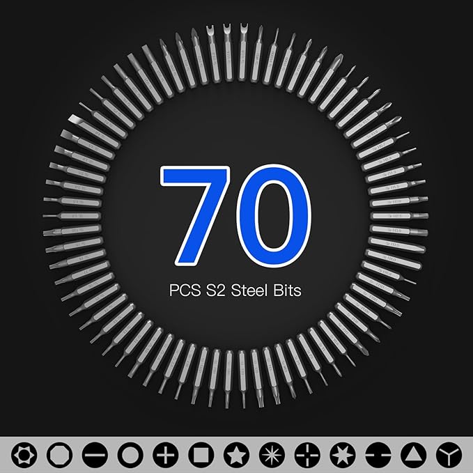 - Mini electric screwdriver sets equipped with 70 magnetic bits, each bit has a corresponding model number above, easy to use; The electric torque of mini screwdriver is between 0.15 to 0.3N.m, the electric maximum torque is 0.3N.m, please don't use it on big project, it will damage the screwdriver