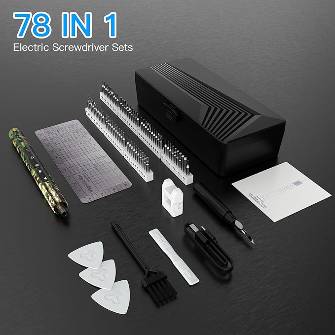 - Included Components : USB Cable, electric screwdriver handle, magnetizer, plastic prying tool, precision specialty bits