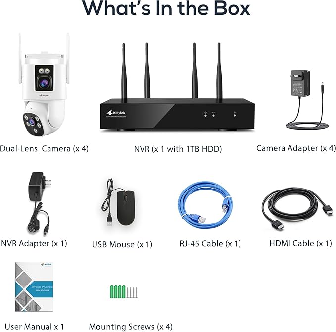 Kittyhok Dual Lens Wireless Security Camera System, 4pcs 2K Outdoor Camera with 2.4/5GHz WiFi, Pan & Tilt, Auto Tracking, Human Detection, Color Night Vision, 16CH Wi-Fi 6 NVR with 1TB HDD, KWDP164
