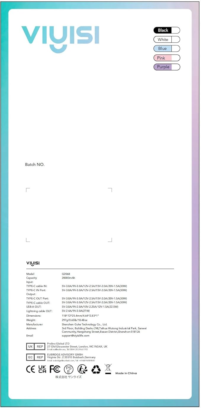 - Battery Capacity : 20000 Milliamp Hours