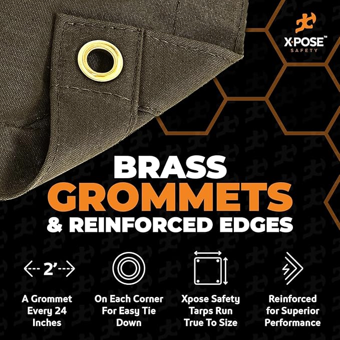- REINFORCED BRASS GROMMETS - This water-resistant tarp is engineered with brass grommets at all 4 corners and every 24 inches along the double-stitched outer seam, with triangle reinforcement in each grommet delivering powerful rip-stop tear resistance and tie-down ability in harsh weather conditions.