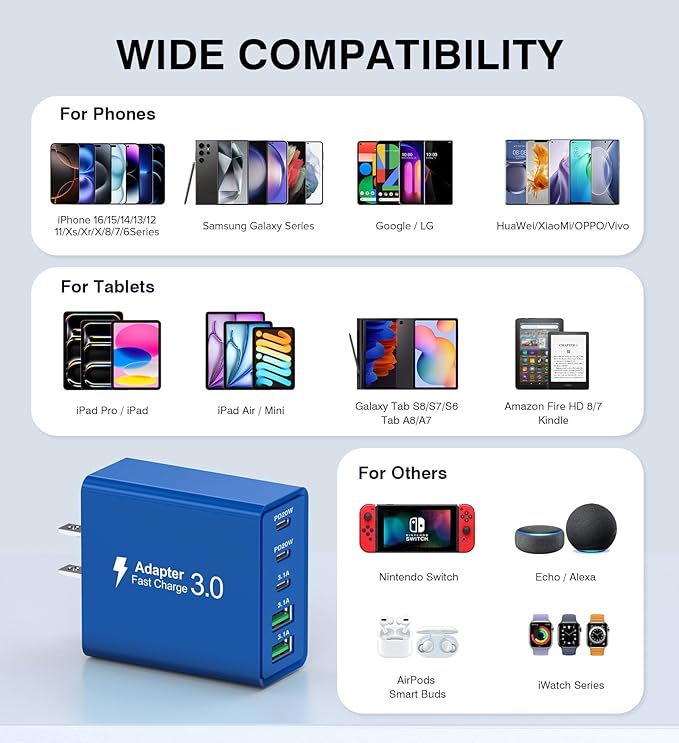 - Universal Compatibility:This type c charging block compatible with All smartphones and tablets, such as iPhone 16/16 Pro/16 Plus/16 Pro Max/15/15 Pro/15 Plus/15 Pro Max/14/14 Pro/14 Pro Max/14 Plus/13/13 Pro/13 Pro Max/13 Mini/12/12 Pro/12 Pro Max/12 Mini/11/11 Pro/11 Pro Max/XS/XS Max/XR/X/8/8 Plus/7/7 Plus/6/6S/SE 2020, usb c charger for iPad Pro/Air/Mini, USB a Charger Compatible for Samsung Galaxy S23/S22/S21/S20/S10/S9/S7/A12/A13/A22/A32/A52/A53/Note 20 10/Z Fold 3, LG, Google Pixel, Kindle, Wireless charger, Tablets, Switch, etc