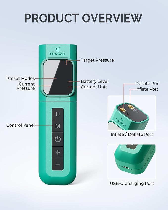 - Intuitive Digital Display: Monitor your pump's battery with a clear digital indicator and switch from PSI, BAR, or KPA with our 3-unit display