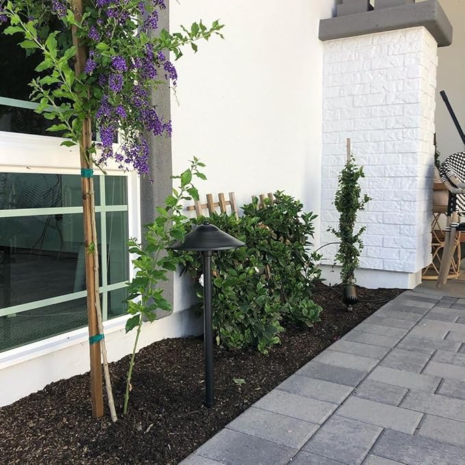 - 4 SOLID BRASS PATH LIGHTS - Costructed of solid brass, the Max Spread is our most popular path light; this version has a durable black powder coating that provides a modern look. Their 16-foot diameter region of illumination is 30 percent larger than most of our other path lights. Features pro-grade internal components, a 4-foot lead wire and ceramic white paint under the shade to increase ground illumination. Complies with International Dark-Sky Association standards.