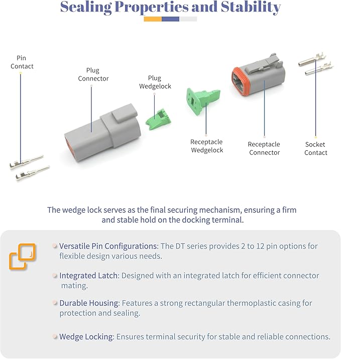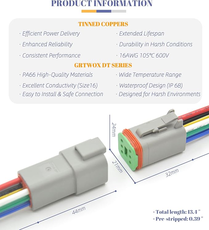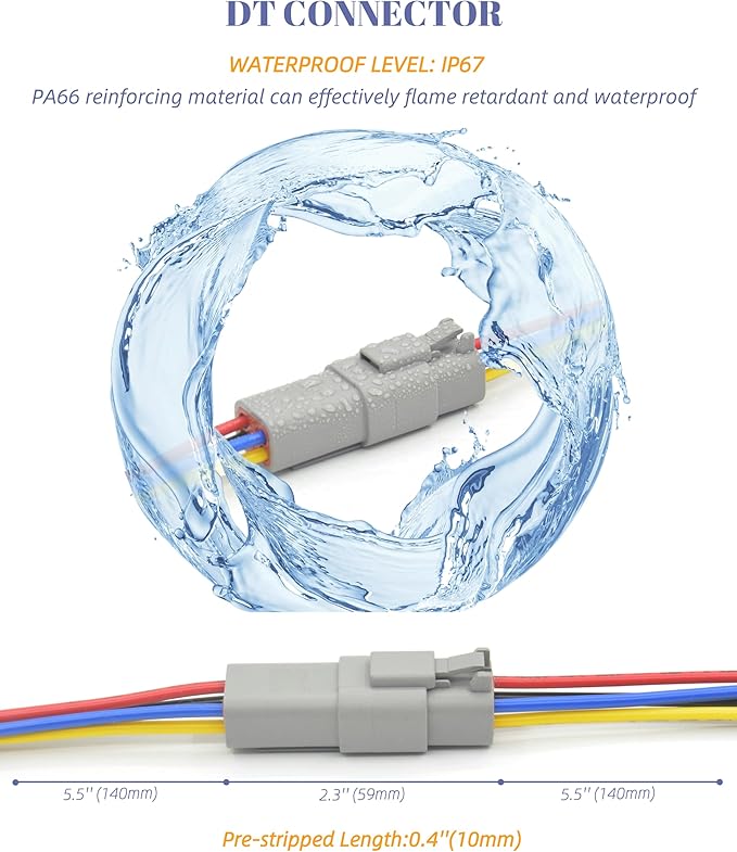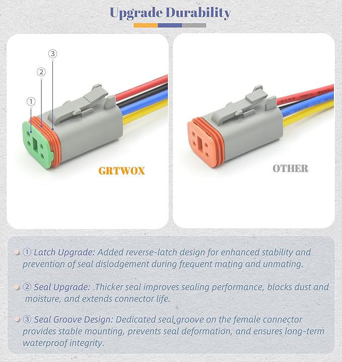 - 【Easy Installation without Tools】This DT connector kit is designed for quick and hassle-free installation. It includes 2sets 4 - pin male and female connectors with pre - attached wires, eliminating the need for crimping pliers. The connectors feature a wedge lock that ensures contacts are fully seated and securely held in place.