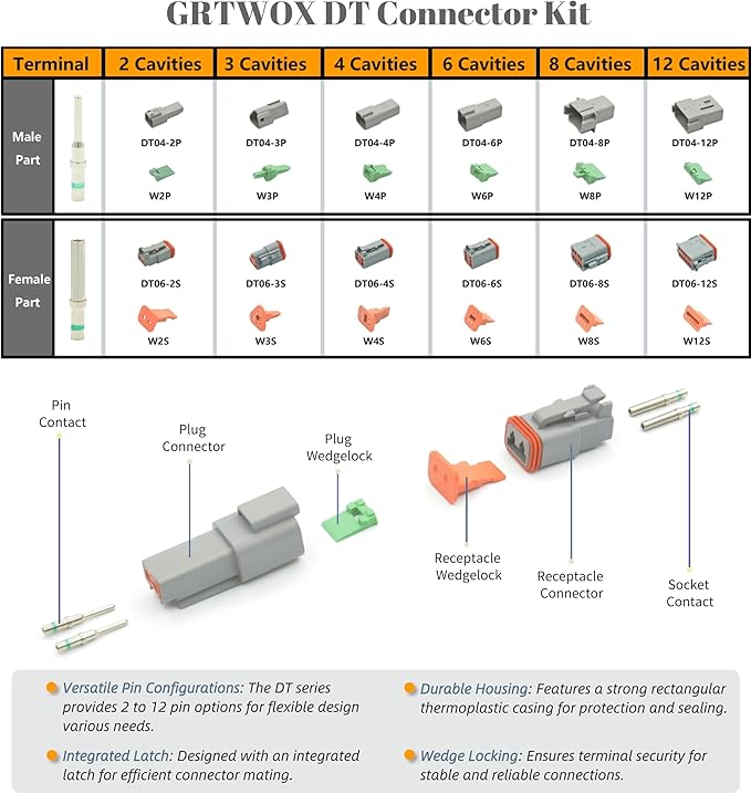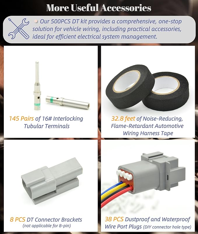 - 【Comprehensive DT Series Connector Kit】This 502 - piece DT Series Connector Kit includes a variety of 2, 3, 4, 6, 8, and 12 - pin connectors, suitable for a wide range of applications such as boats, motorcycles, racing cars, RV lights, quad bikes, and more. Made from flame - retardant nylon (PA66 + 30% GF), these connectors are waterproof, dust - resistant, and designed for safe and durable installation.