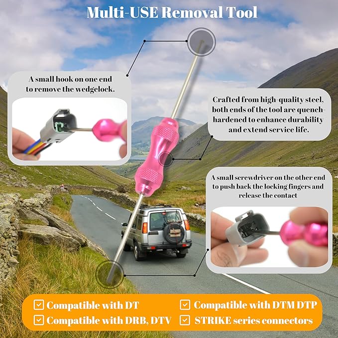 - 【Professional Tools for Easy Assembly】The kit comes with a professional 4 - way indent crimping tool designed for 14 - 20AWG wires, ensuring smooth and consistent crimps. Additionally, a removal tool is included for easy disassembly and maintenance of various Deutsch series connectors, including DT, DTM, DTP, DRB, DTV, and STRIKE Series.