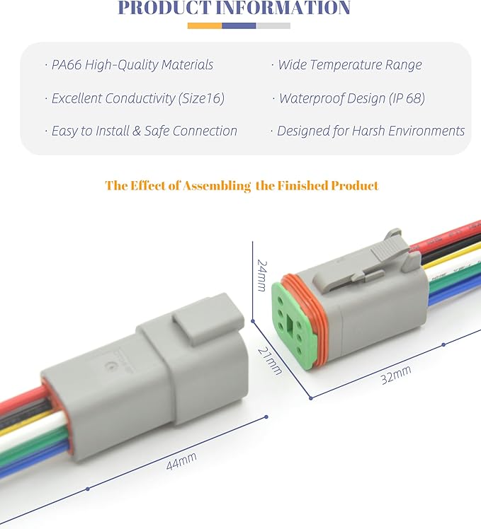 - Easy Installation without Tools】 This DT connector kit is designed for quick and hassle-free installation. It includes 2sets 6 - pin male and female connectors with pre - attached wires, eliminating the need for crimping pliers. The connectors feature a wedge lock that ensures contacts are fully seated and securely held in place.