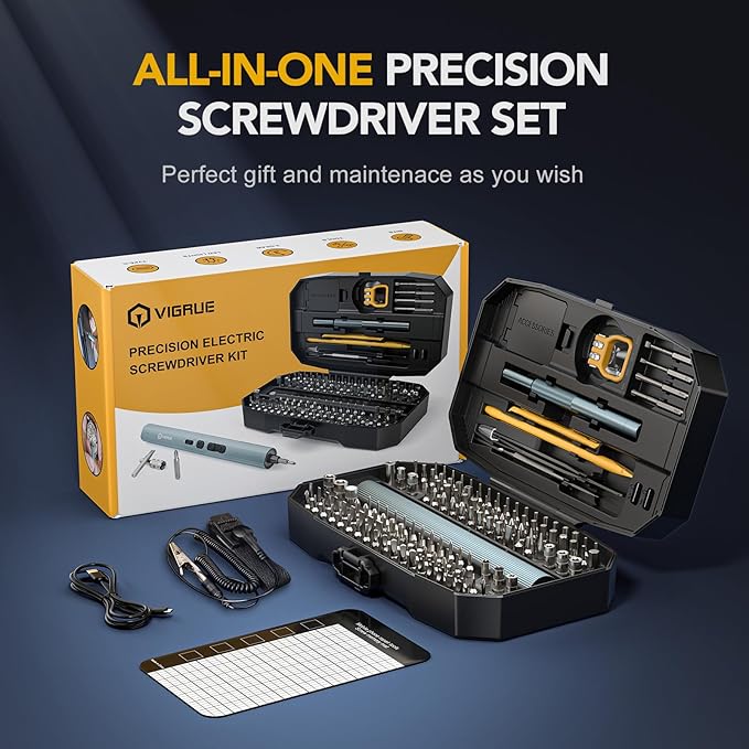 - 155-in-1 Mini Electric Screwdriver: VIGRUE Max 3.7V Mini Electric Screwdriver set including 140 pcs Magnetic Bits, Pry Bar, Led, Tweezers, electric and manual screwdriver perfect for repair Electronics like Phone Watch Laptop Camera. This precision screwdriver kit is the idea gift for Electronics Enthusiasts.