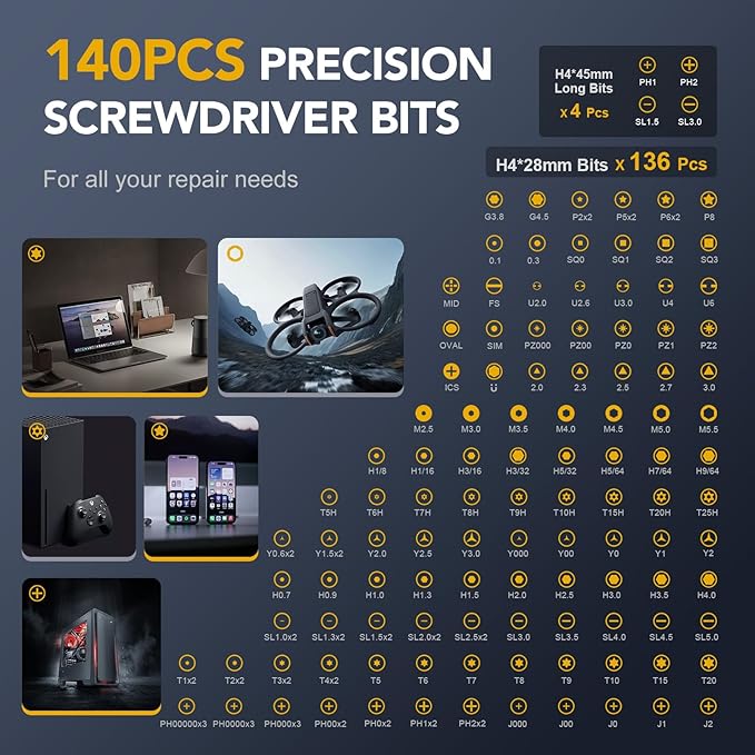 - 140-in-1 Metal Bits: With 140 bits of 26 categories, the VIGRUE mini electric screwdriver can prepare you for a variety of repair tasks. The S2 hardened steel guarantees a long and safe serving life. The VIGRUE brand has always adhered to the principle that A good quality tool makes good quality work.