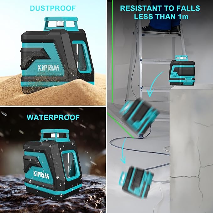 - Enhanced Visibility with 360° Coverage:The Kiprim LV8D's green laser beam offers superior visibility, shining five times brighter than red lasers and now with five laser lines, including one vertical and four horizontal at 360°. Whether indoors or outdoors, even in brightly lit environments, you’ll experience unmatched clarity, precision, and full-room coverage, ensuring seamless alignment and accurate measurements over extended distances.