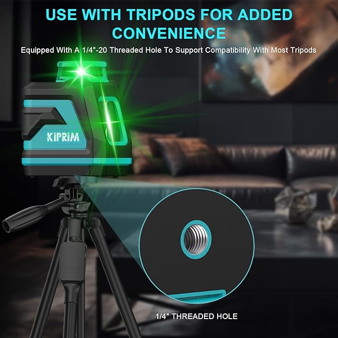 - Tripod Compatibility for Enhanced Stability:The Kiprim LV8D is compatible with standard 1/4'' tripods, providing enhanced stability and versatility for your projects. Whether you’re working on uneven surfaces or need to elevate the laser for optimal visibility, this compatibility ensures reliable performance and precise alignment in any setting.